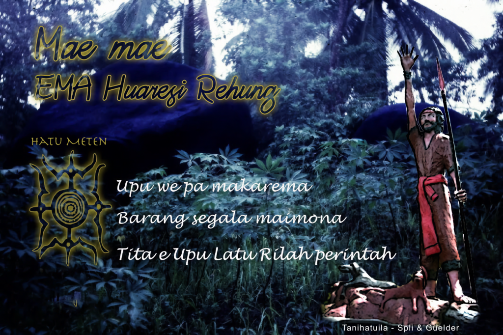 - Stichting van Ema: Na conflicten met Naku werpt Kapitan Ading Adang Tanihatu’ila vanuit Hausasiwa zijn speer in het oerwoud. De kreet “E mae! E mae!” (Kom! Kom!) geeft het dorp zijn naam: Negeri Ema (totemnaam: Huaresi Rehung).