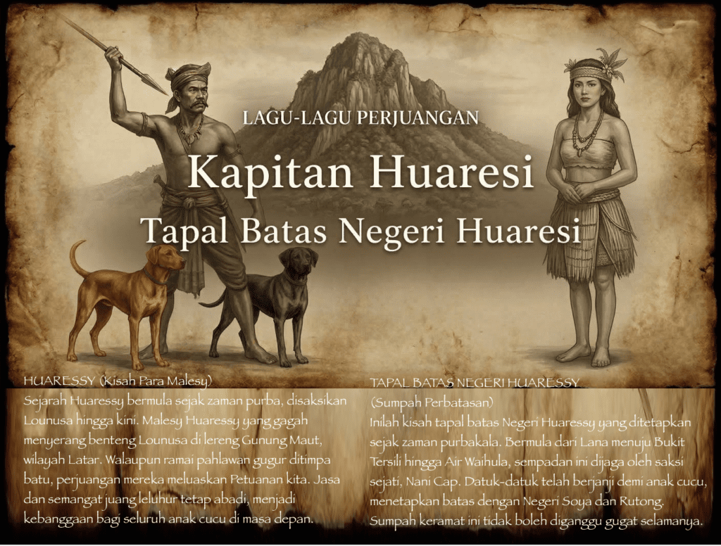 De plek waar de speer de aarde doorboorde, werd Amanghupung Soa Molo gedoopt – het heilige, letterlijke hart van de nieuwe nederzetting. Het omringende vruchtbare land en de bossen noemden zij Huaresi Rehung, de totemnaam van hun dorp. Zo werd Negeri Ema gesticht, ook wel Batu Hitam, in de oude taal Hatu Meten, genoemd, als erfgenaam van de eerste nederzetting. Als symbool van hun mystieke oorsprong toont de vlag van Ema tot op de dag van vandaag de twee trouwe honden, Sapili en Guelder, die in de speer van de Kapitan bijten – een eeuwige viering van leiderschap, lot en de magische band tussen mens, dier en land.