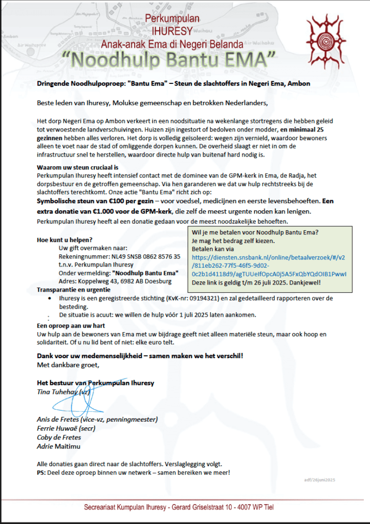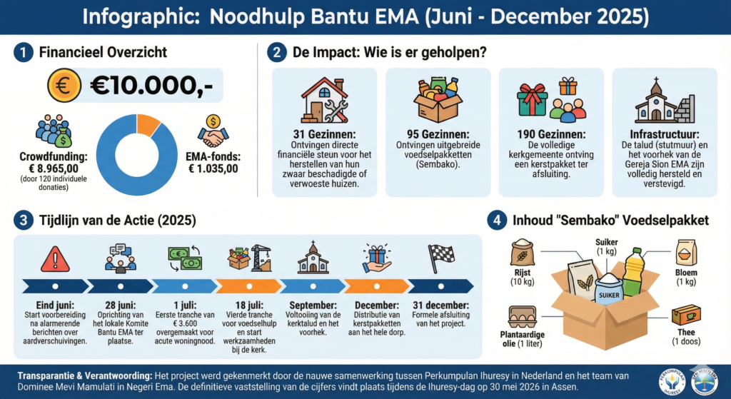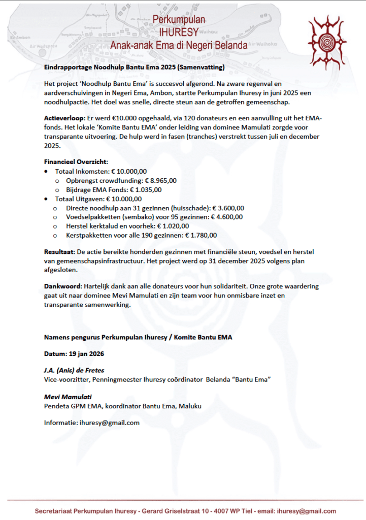 De respons was onmiddellijk en hartverwarmend. Vanuit Nederland en daarbuiten reageerden talloze betrokkenen met een gift, gedreven door de wens om de verbondenheid met de Molukken tastbaar te maken. Deze steun werd lokaal gekanaliseerd door het speciaal opgerichte Noodkomite Bantu EMA, onder de bezielende leiding van dominee Mevi Mamulati en zijn team. Zij zorgden ervoor dat elke euro zijn weg vond naar de meest kwetsbaren: naar gezinnen die hun huis moesten herstellen, naar tientallen huishoudens die een voedselpakket ontvingen, en naar het herstel van de kerkinfrastructuur, een spiritueel en sociaal hart van het dorp. Ter afsluiting kon dankzij de voortdurende generositeit zelfs elk van de 190 gezinnen in de gemeente een feestelijk kerstpakket ontvangen.