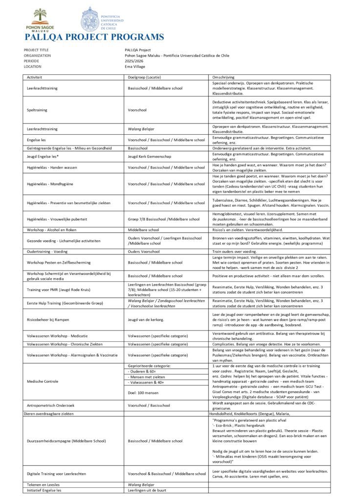 Het Pallqa Project is een veelomvattend gemeenschapsontwikkelingsinitiatief dat in 2025/2026 wordt uitgevoerd in Ema Village. Het project is een samenwerking tussen Pohon Sagoe Maluku en de Pontificia Universidad Católica de Chile en heeft als doel om via een geïntegreerde aanpak de levenskwaliteit, educatie en veerkracht van de gemeenschap te verbeteren.