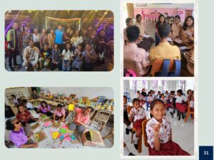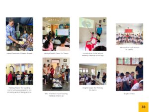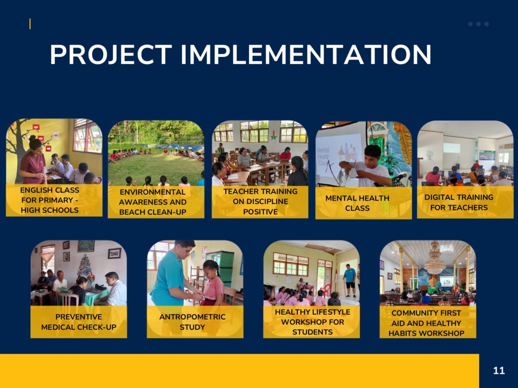 De activiteiten zijn opgebouwd rond drie centrale pijlers: onderwijs, gezondheid en duurzaamheid. Binnen het onderwijs ligt de focus op capaciteitsopbouw voor leerkrachten, met trainingen in klasmanagement, digitale vaardigheden (zoals het gebruik van Canva en AI) en specifieke methodieken voor spelgebaseerd leren. Daarnaast zijn er directe lesprogramma’s voor studenten, zoals Engelse lessen, teken- en leeslessen in de Walang Belajar, en praktische trainingen zoals EHBO (PMR) en rampenrisicobeheer voor de jeugd.